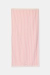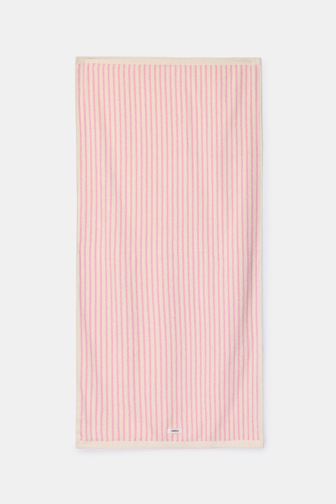 Roze-wit gestreept strandlaken van badstof. Wordt geleverd in een bijpassende zwemzak van badstof met geborduurde vlinder. Formaat handdoek 70cm x 140cm.