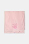 Roze-wit gestreept strandlaken van badstof met geborduurde vlinderprint. Formaat 100cm x 200cm.