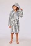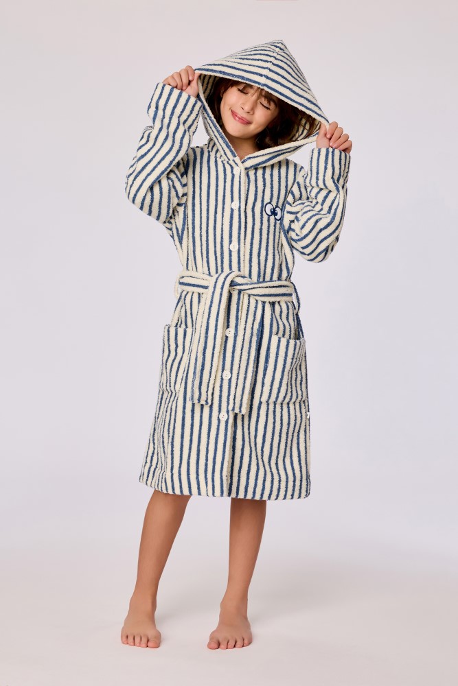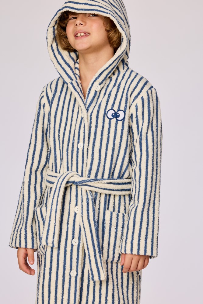 Unisex badjas van 100% katoen geweven badstof. Deze ecru-blauw gestreepte badjas heeft een ruime kap, 2 ruime zakken vooraan en de Woody ogen geborduurd. De kamerjas sluit met knopen, en vanaf maat 8 jaar voorzien we hier een ceintuur bij. Verkrijgbaar in maten 6M-16Y.