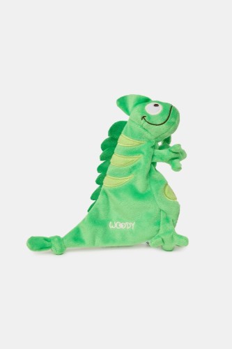 Groen knuffeldoekje van velours in de vorm van een kameleon. Het knuffeldoekje is +-23 cm groot.