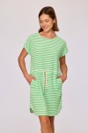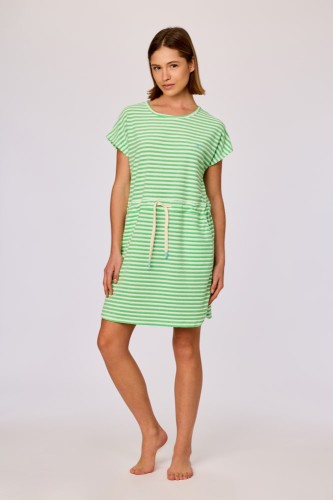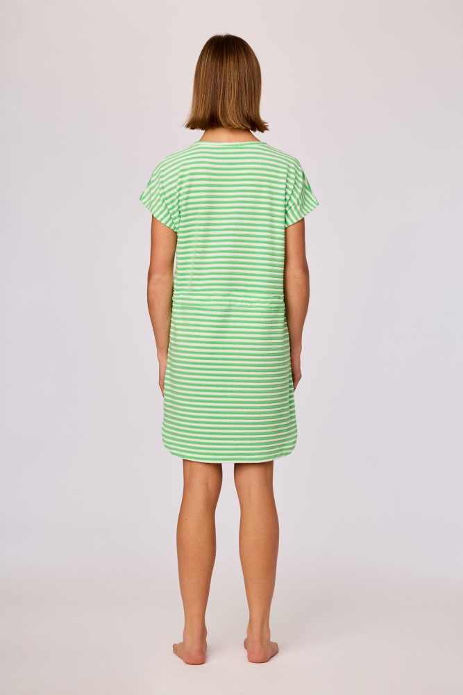 Ecru-groen gestreepte strandjurk van badstof voor meisjes en dames. Dit jurkje heeft korte mouwen, en zakken opzij. Vooraan wordt de taille benadrukt door middel van een striklint. Verkrijgbaar in maten 2Y-XXL.