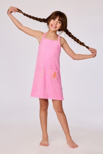 Roze strandjurk van badstof voor meisjes. Dit jurkje heeft spaghettibandjes die gekruist zijn achteraan, en zakken vooraan met een kleine dierenprint. Verkrijgbaar in maten 2Y-16Y.